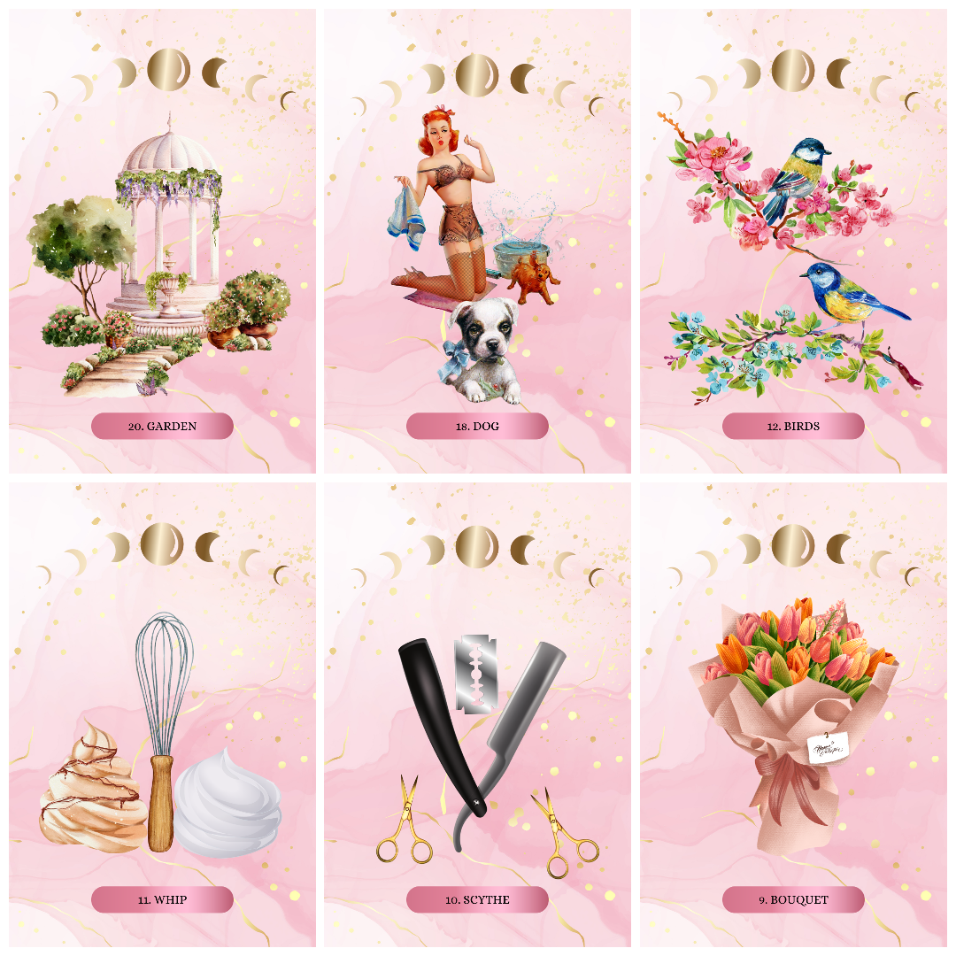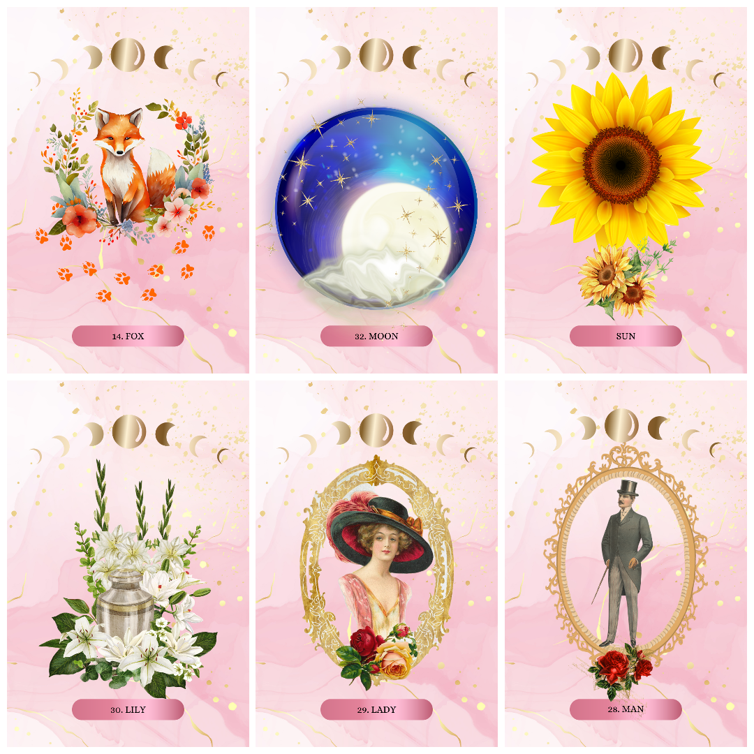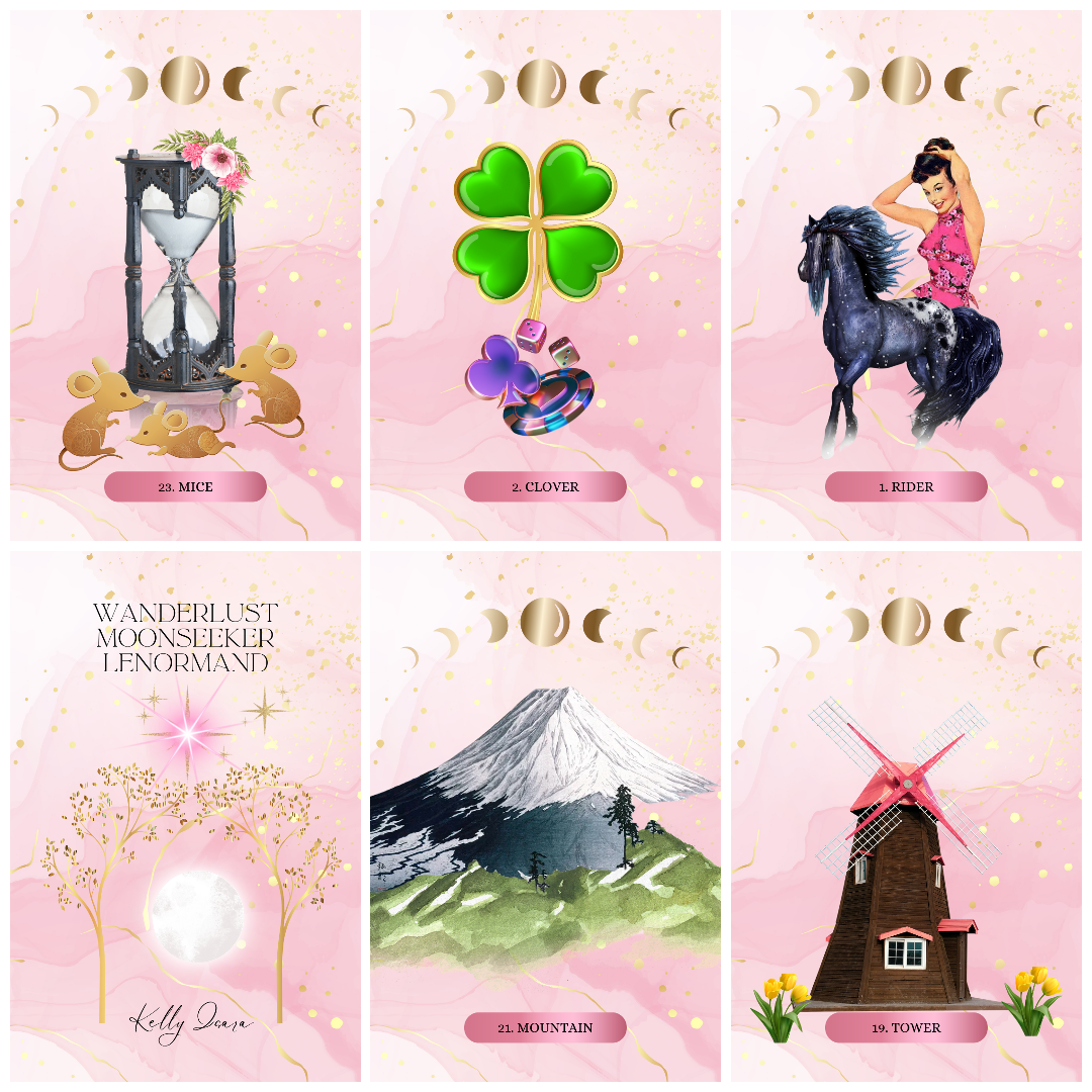 The blend of images and art elements, from the tarot deck style: gives the Wanderlust Moonseeker Lenormand a sweet soft guidance.